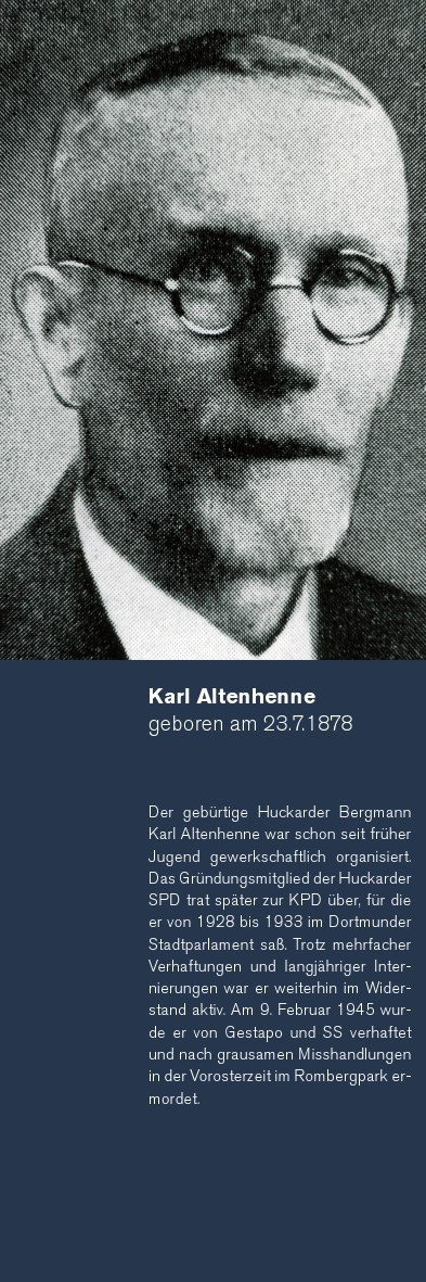 Das Mahnmal in Huckarde wurde im Jahre 1948 von der VVN in Erinnerung an die von der Gestapo Karfreitag 1945 ermordeten Karl Altenhenne und Bruno Nowak errichtet. An beide Widerstandskämpfer aus Huckarde möchten wir ebenfalls erinnern und ihrer gedenken.