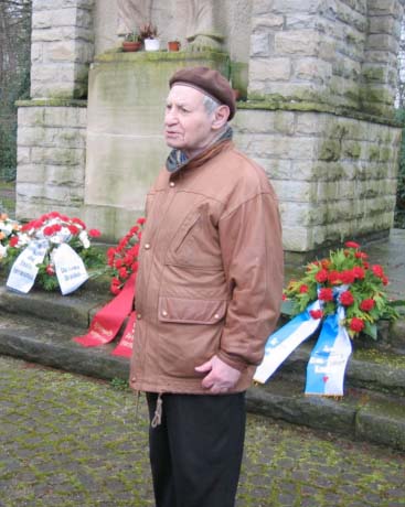 In der Karwoche 2008 war Wladimir Gall Gast des Internationalen Rombergpark-Komitees. In der Steinwache erzählte er von seinem Einsatz 1945 in Berlin. Auf diesem Foto sehen wir Wladimir Gall bei einer Ansprache am Sowjetischen Ehrenmal auf dem Internationalen Friedhof in Dortmund-Brackel.