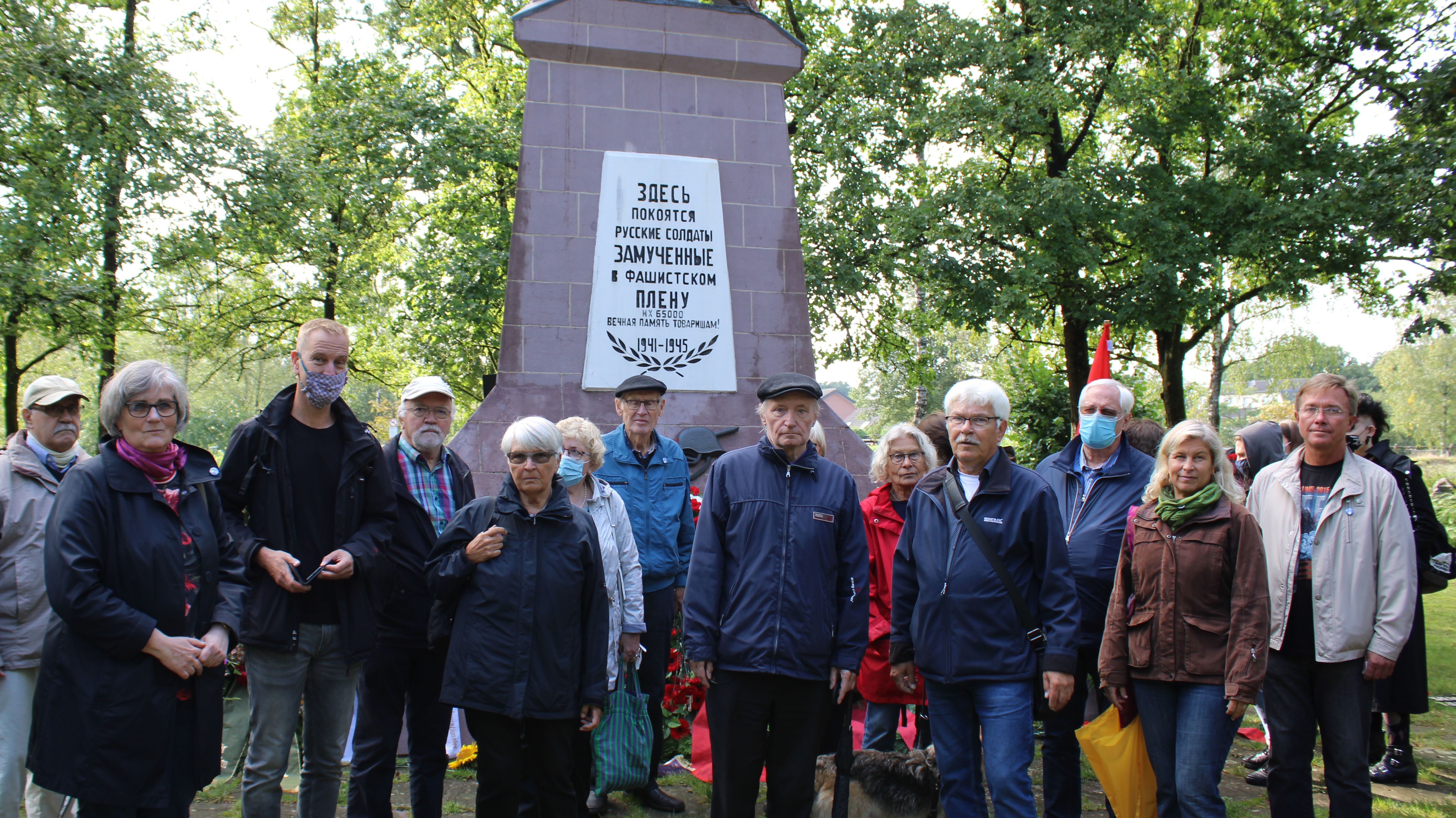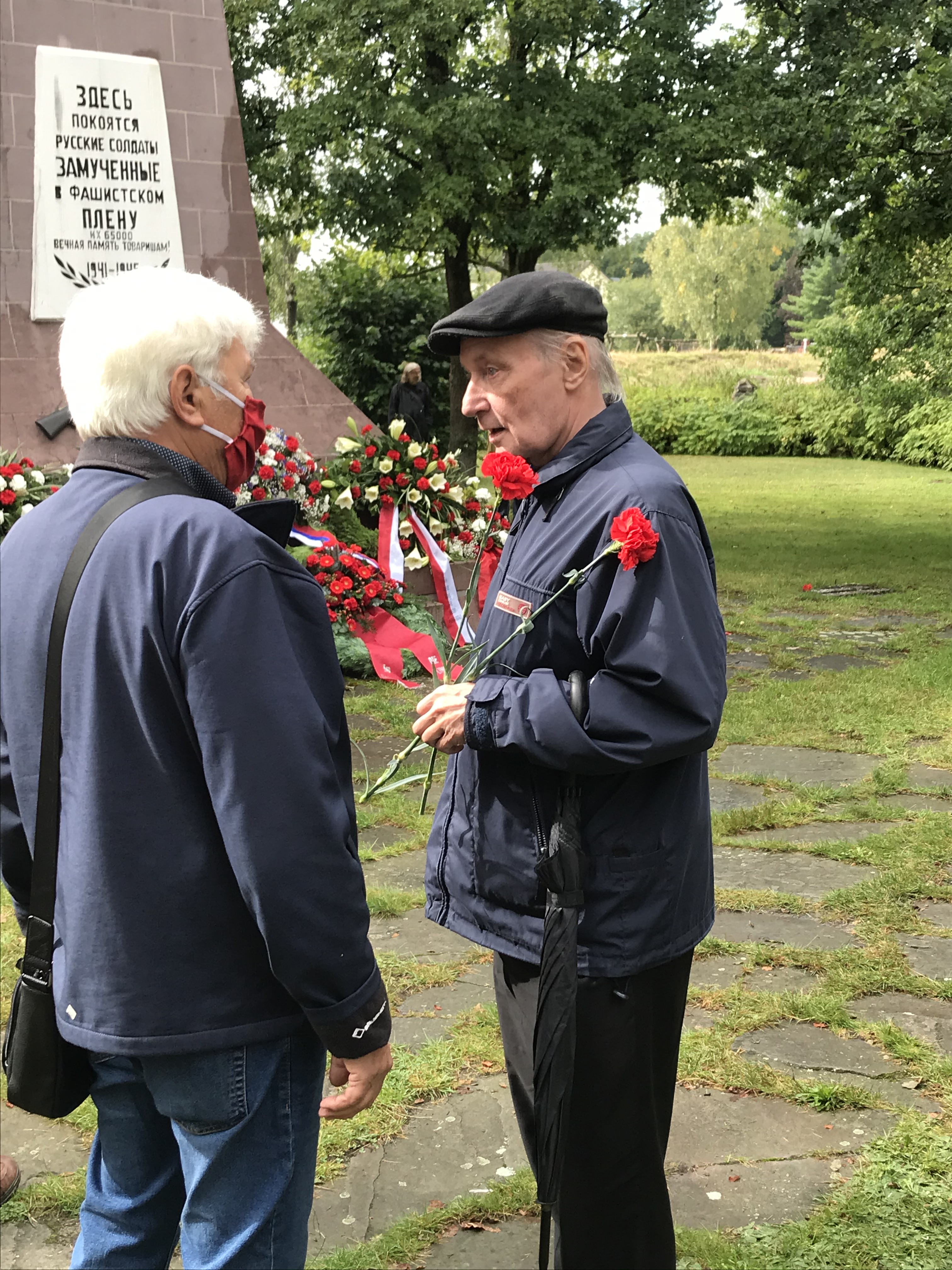 In diesem Jahr sprach Eugen Drewermann zu 250 Menschen, die trotz Corona-Beschränkungen gekommen war. Bereits in früheren Beiträgen hatte er über das Verbrechen der Wehrmacht an Millionen Rotarmisten, die in deutscher Kriegsgefangenschaft an Hunger und fehlender Versorgung zugrunde gingen, gesprochen. In seiner beeindruckenden Ansprache während der Gedenkstunde kritisierte er die aktuelle Politik der Bundesregierung, die nichts für eine friedliche Politik mit Russland tut. Er erinnerte, an die lange gemeinsame Geschichte und die reiche Kultur, die Deutsche und Russen verbindet, und forderte eine Politik des Friedens mit Russland. (Text: Hannelore Tölke)