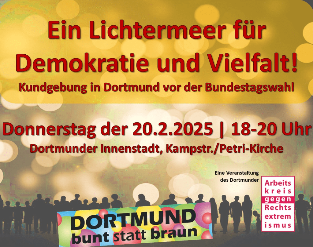 Der Förderverein Steinwache – Int. Rombergparkkomitee e.V. unterstützt den Aufruf des Dortmunder Arbeitskreises gegen Rechtsextremismus zur Kundgebung für Demokratie und Vielfalt: https://www.dortmund-rechts.de/2025/02/